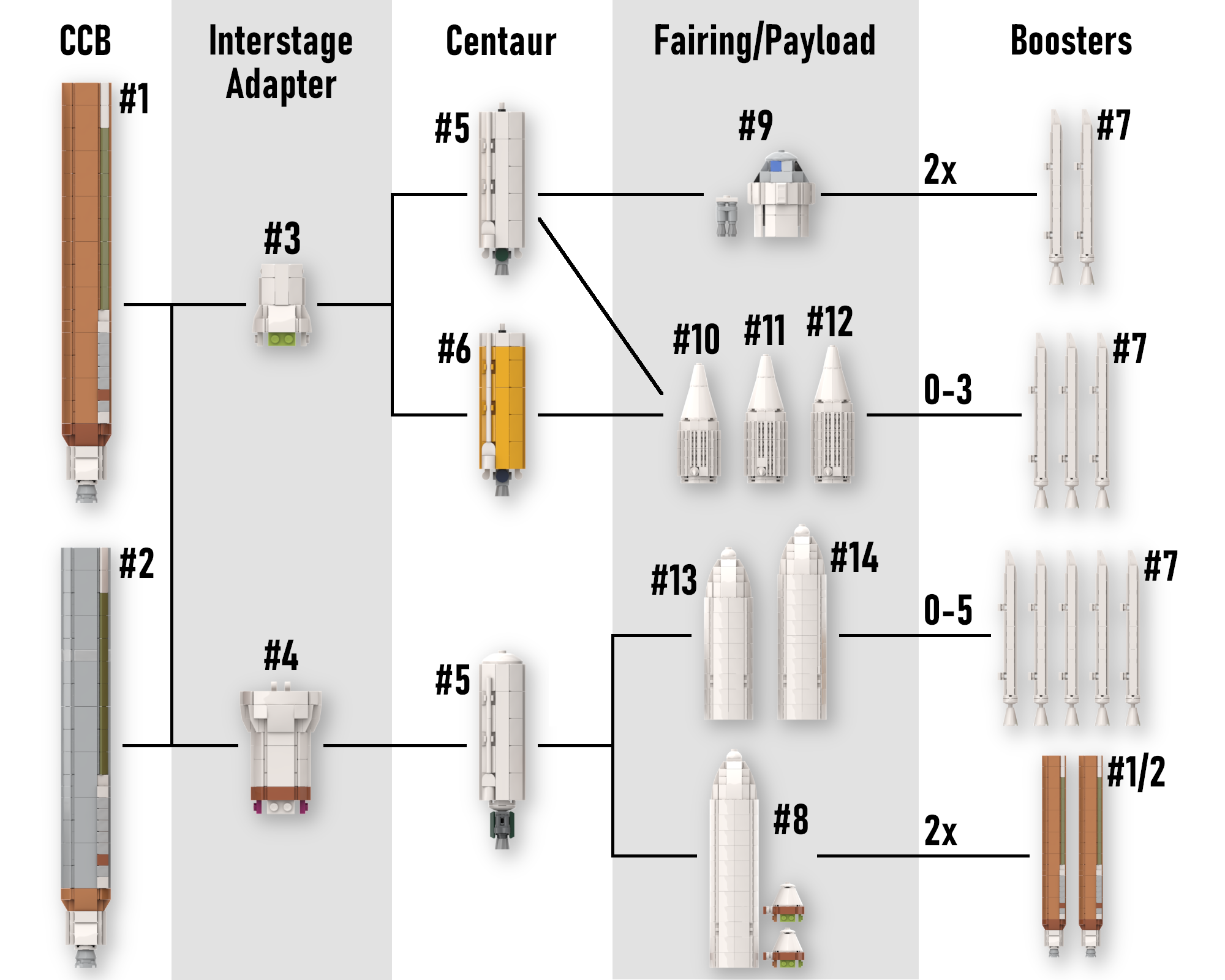 Use the diagram above to assemble the exact configuration you want by following one of the lines and picking one component from each section... or pick multiple components from some sections if you want to be able to reconfigure your Atlas V with different components. Here's the full list of components with corresponding numbers: