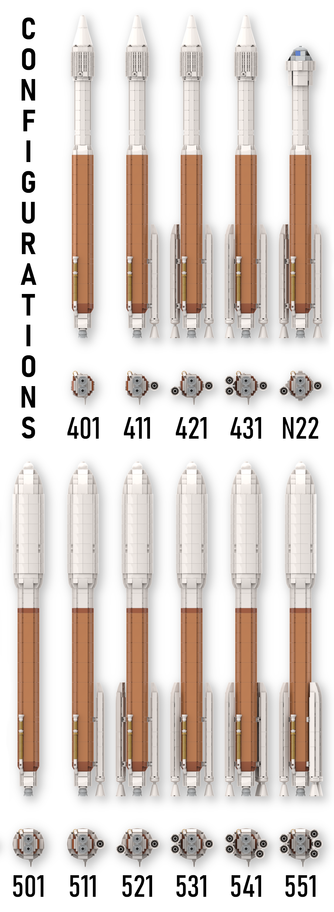 1. Atlas V 500-series [978 pcs] - builds the standard Atlas V 551 with 5 SRBs and the 5m wide fairing, and includes the Mars Rovers' aeroshell and cruise stage as payload (NOTE: since Curiosity and Perseverance launched on the 541 configuration, you'll have to remove one SRB according to the chart if you want to display it accurately).