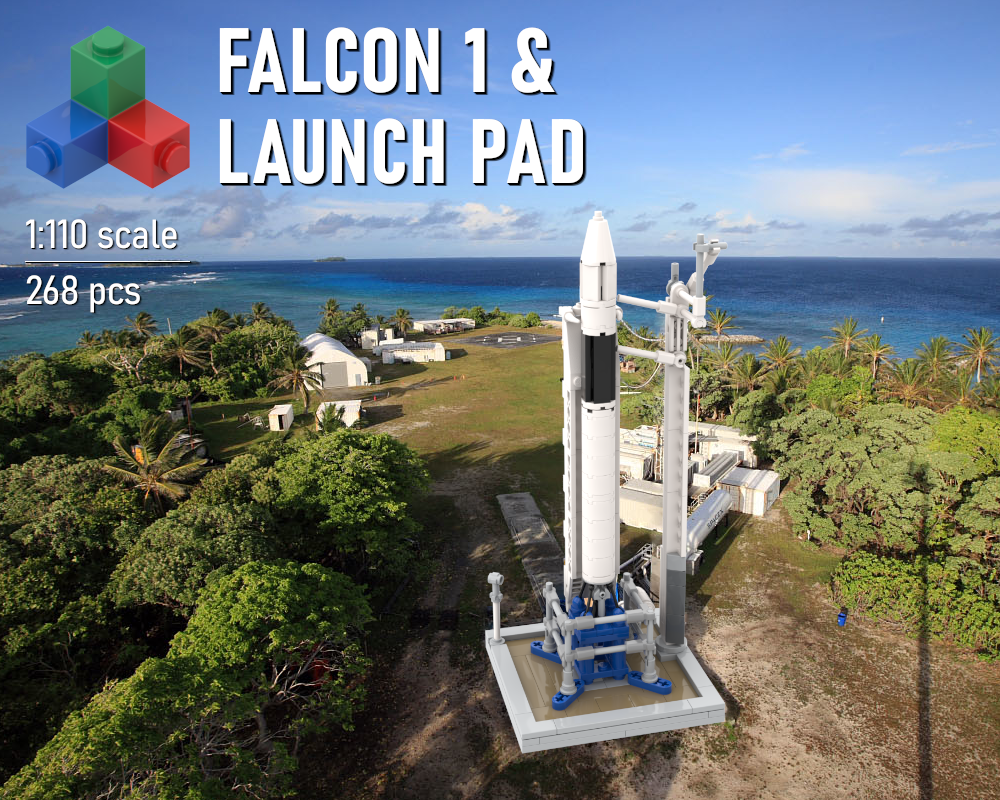 On September 28, 2008, SpaceX successfully reached orbit for the first time with its Falcon 1 rocket on its 4th attempt. Capture that moment with this 1:110 scale model of the rocket and its launch pad! The launch pad is built to resemble the launch pad's appearance as of the 4th launch, see the comparison photo above (the pink covers were removed for launch, that photo is from a static fire).