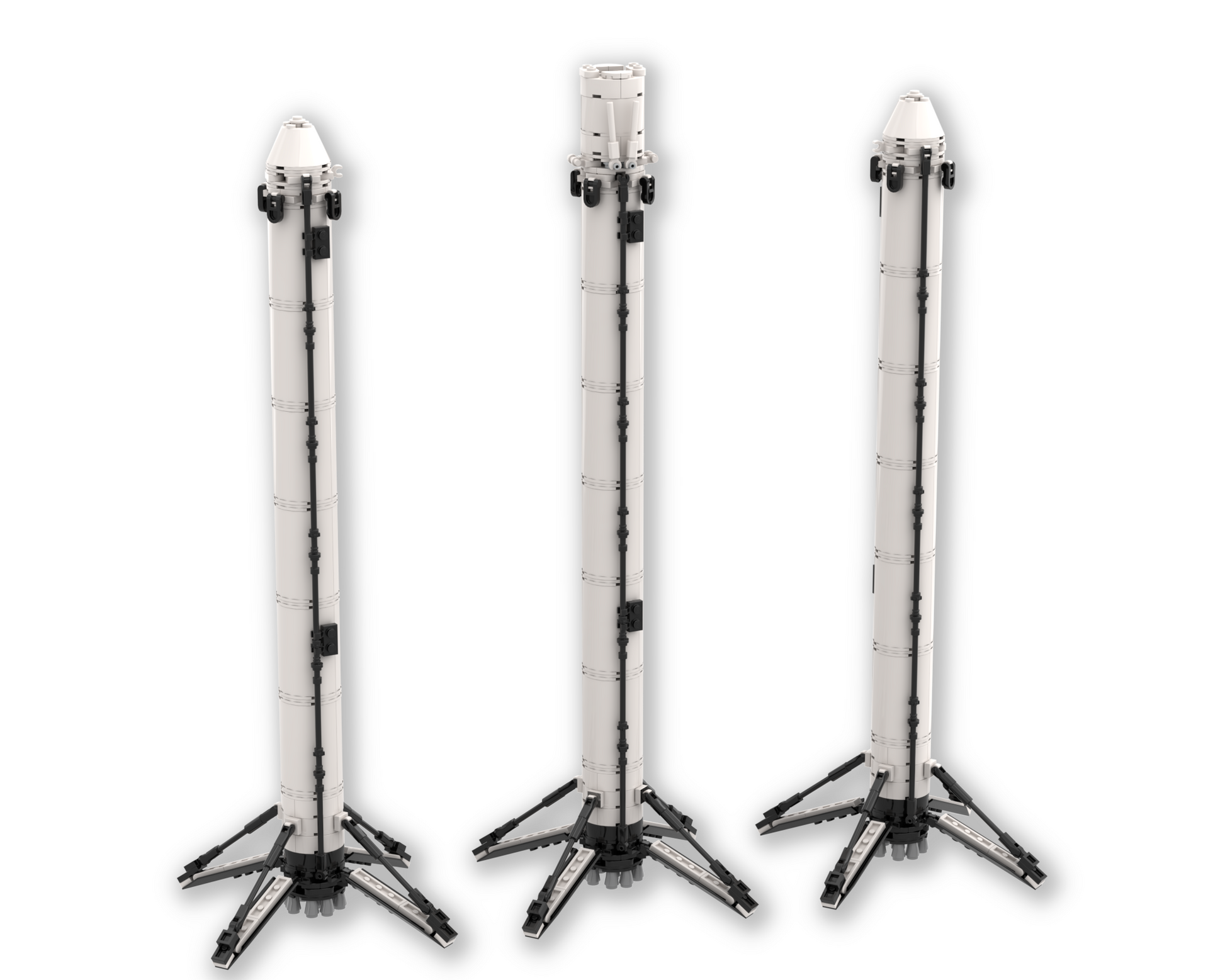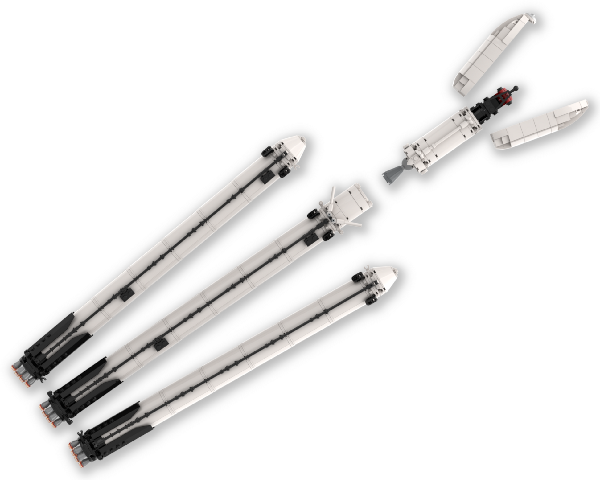 1. Default Falcon Heavy [713 pcs] - builds the standard Falcon Heavy Block 5 with both the Tesla Roadster in the fairing, without the deployment arms for the landing legs.