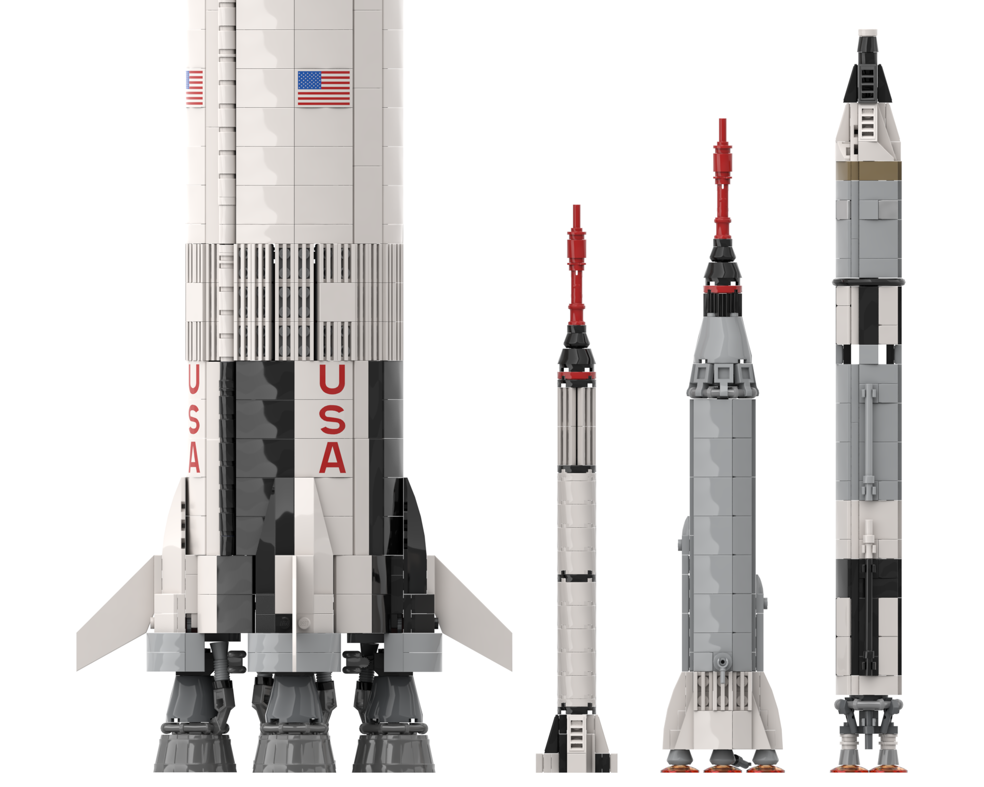 Standing 23-30 cm (9-12 in) tall, these models are 1:110 scale (the same scale as the LEGO® Saturn V set) recreations of the first three American crewed rockets: Mercury-Redstone LV, Mercury-Atlas LV-3B and Titan II GLV (Gemini Launch Vehicle). Despite their small size, they manage to capture the details and proportions of these three historical rockets in a very scale-accurate design. In total, the three rockets consist of 460 pieces, at an affordable price of around $50. The bricks are bought separately following the "How to buy the bricks" section below.