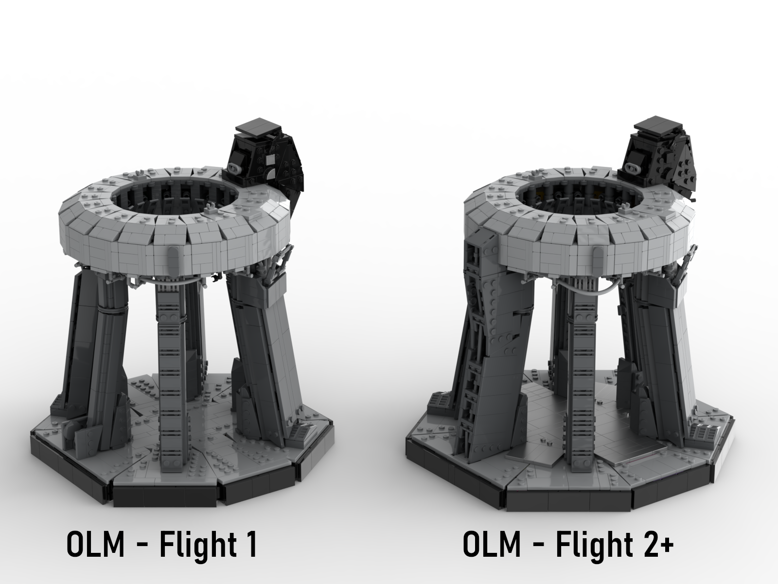 1. OLM with metallic flame deflector part list [2677 pcs] - builds the full Orbital Launch Mount with a metallic silver flame deflector plate that differentiates it from the light gray base. Costs around $300 depending on availability of the metallic silver parts.