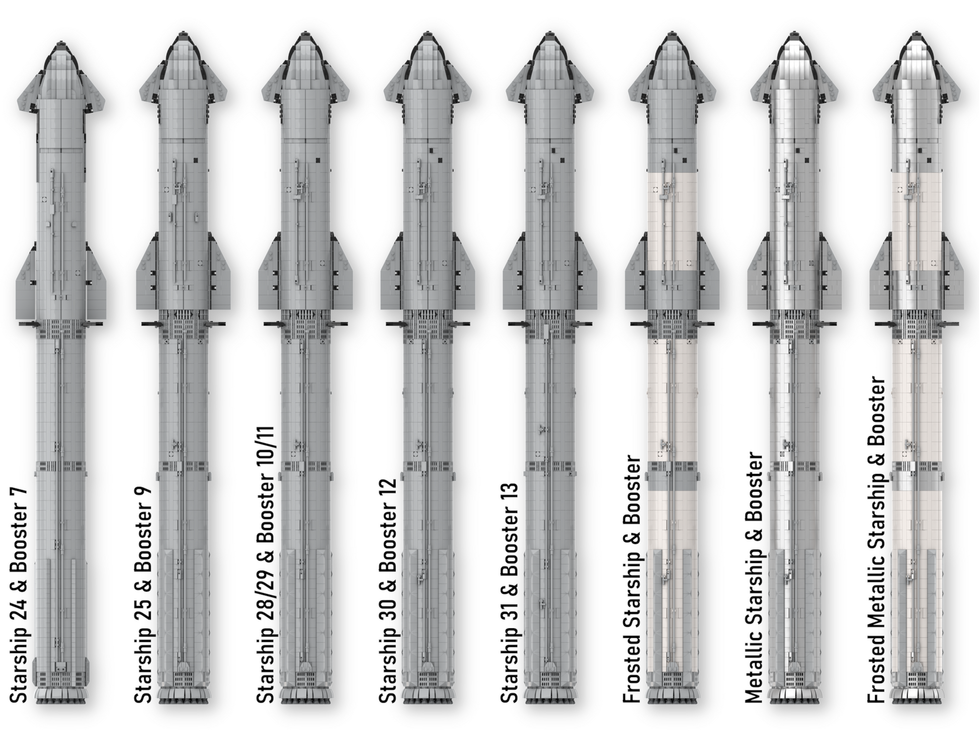 9. Metallic Frosted Starship & Super Heavy [3622 pcs] - builds the metallic silver Starship 30 & Booster 12 with frosted sections on the propellant tanks (~$100 more expensive than the default gray). Use the alternative frosted instructions in additon to the metallic instructions.